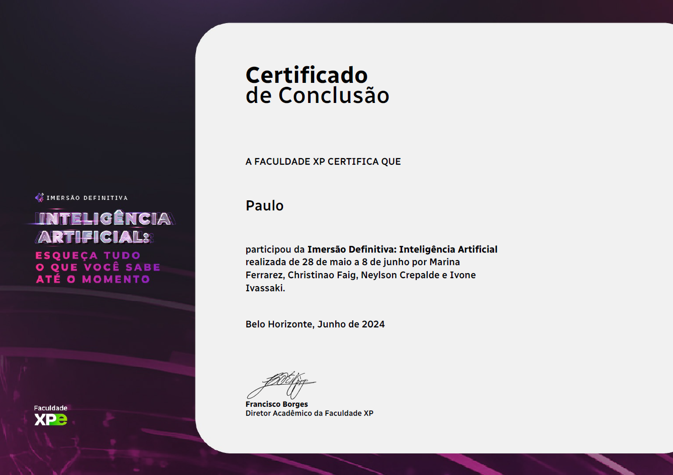 Universidade Católica de Pernambuco (2022 - 2023)Compreensão abrangente dos princípios e aplicações de criptoativos e blockchain. Exploração das tecnologias por trás das criptomoedas e plataformas blockchain, e seu impacto nos negócios e na sociedade.